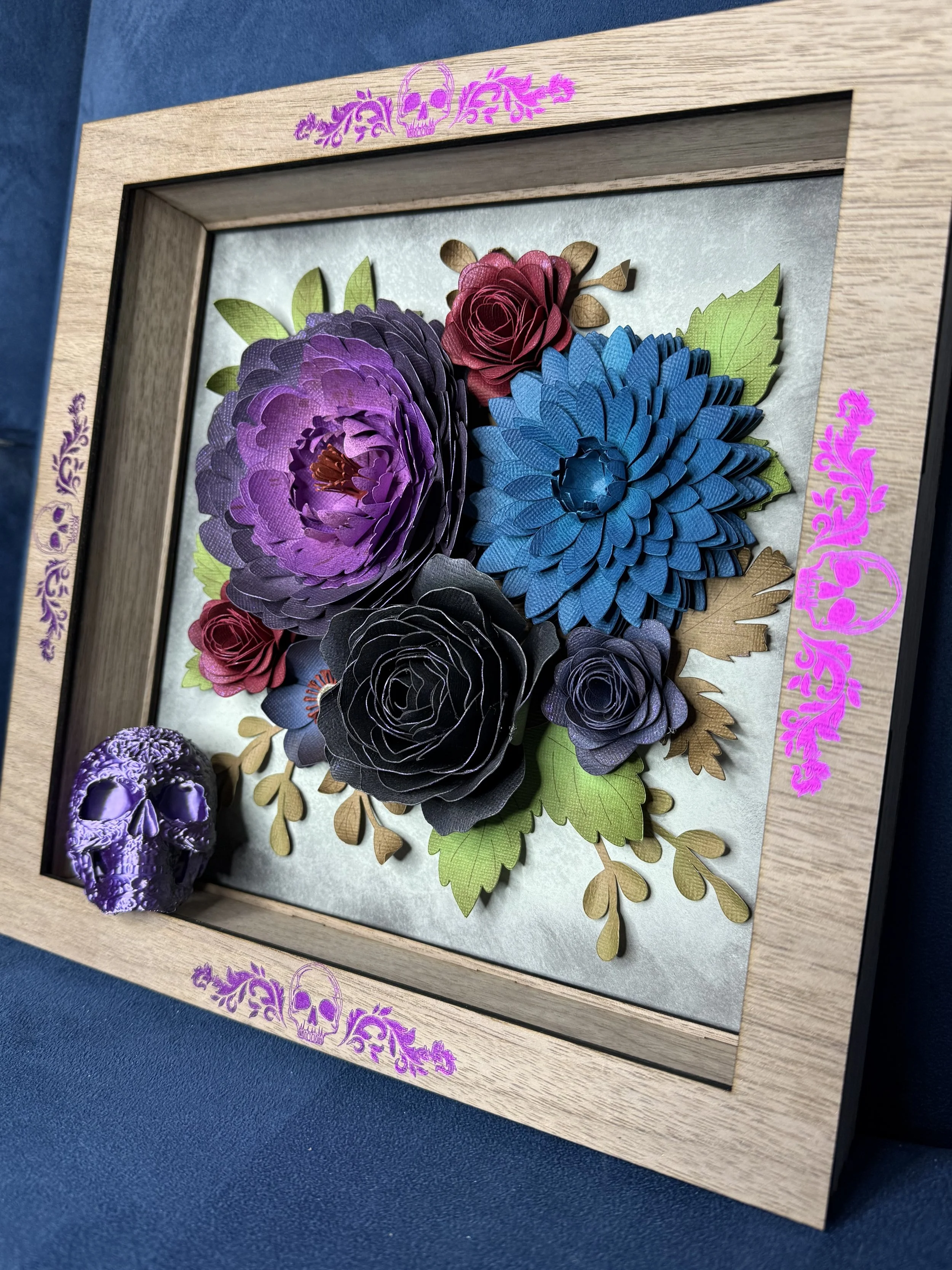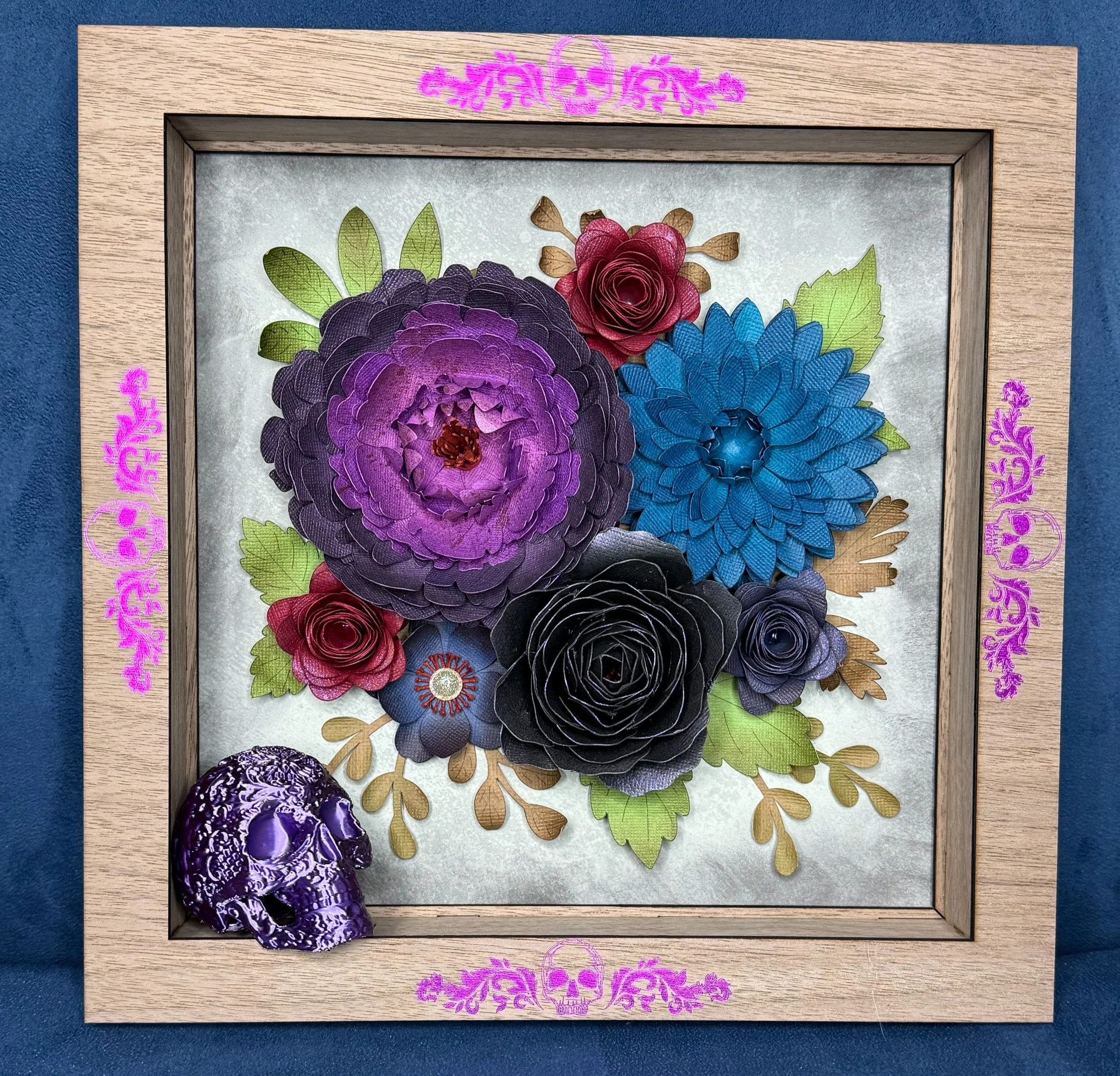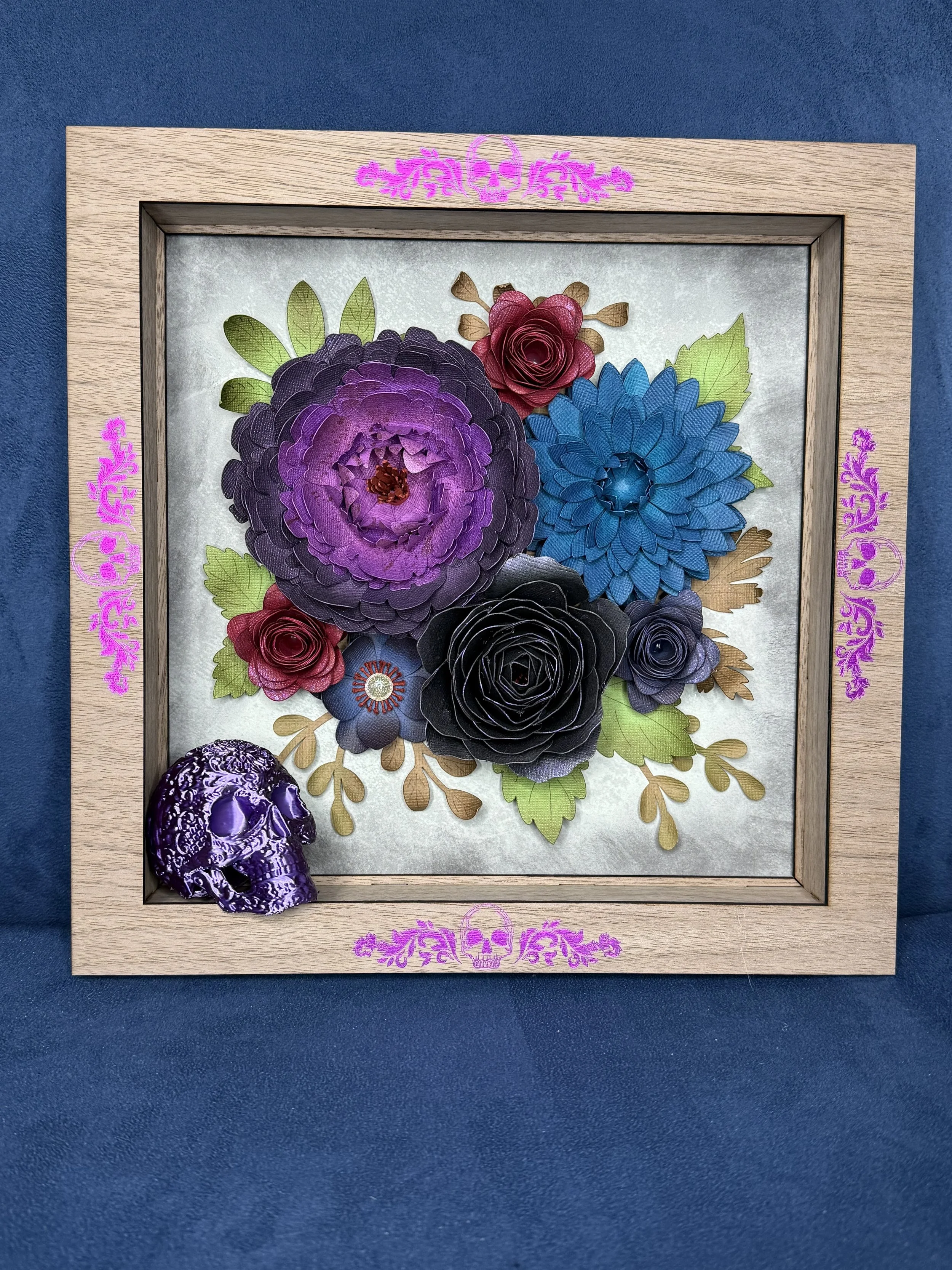 The frame features hand-layered paper flowers in bold, rich colors—accented with metallic purple foil flourishes and tiny skull motifs that nod to the 3D printed Sugar Skull.