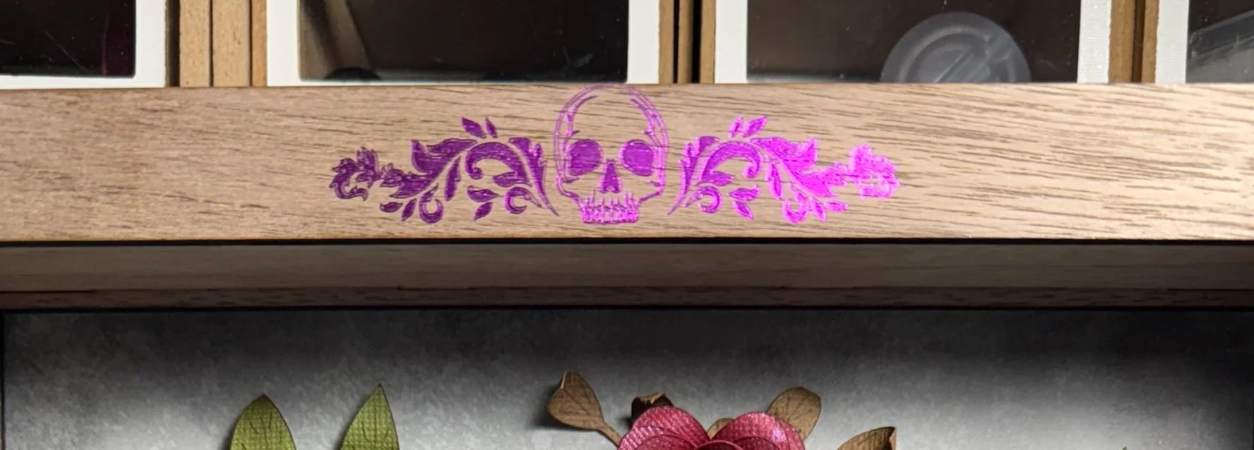 Working with Hot Foil again on this one, adding some purple skulls and flourishes to the wooden frame.