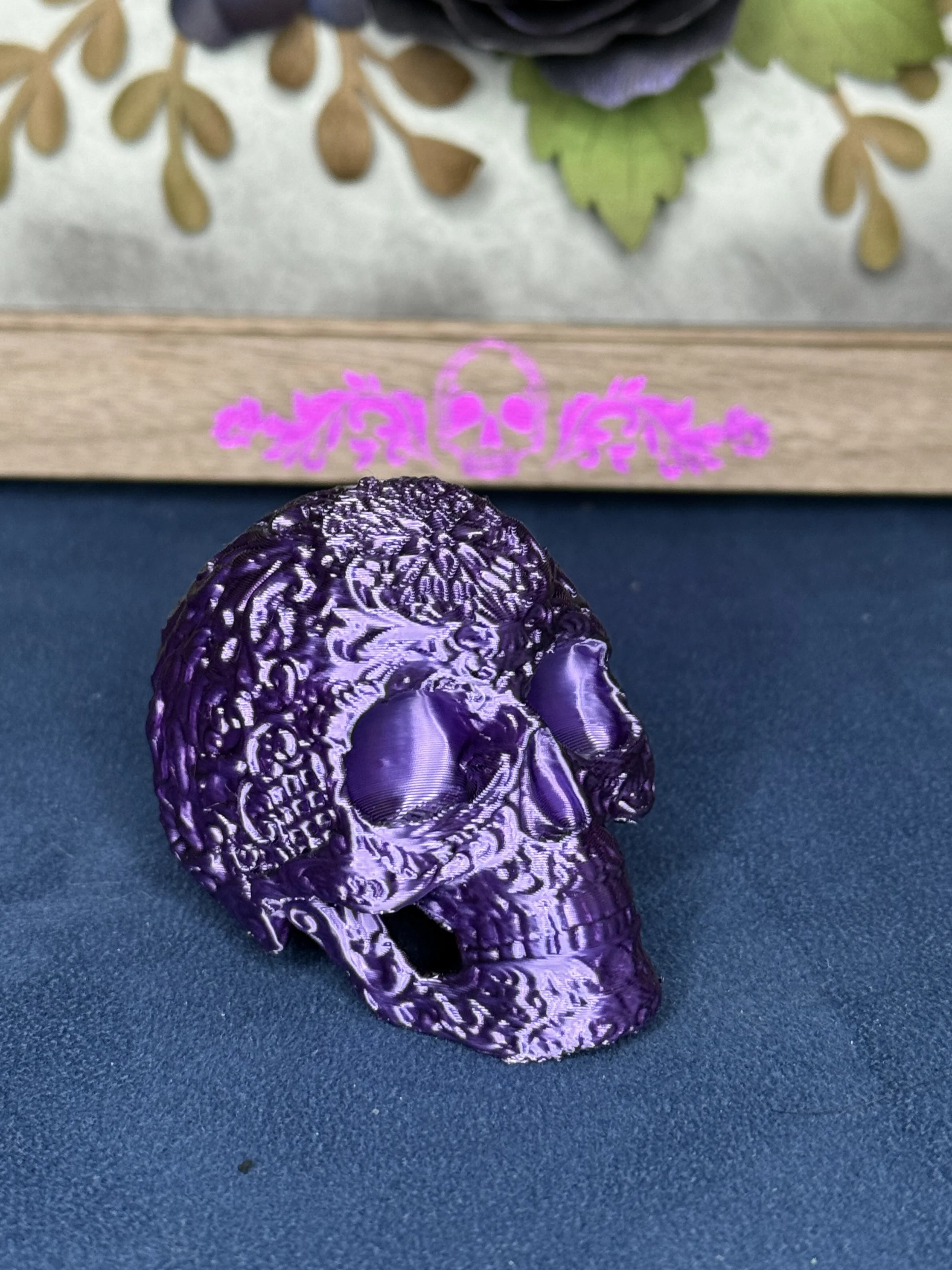 The final part of this frame is a 3D printed Sugar Skull in silk filament to compliment the purple foil and the purples in the flowers.